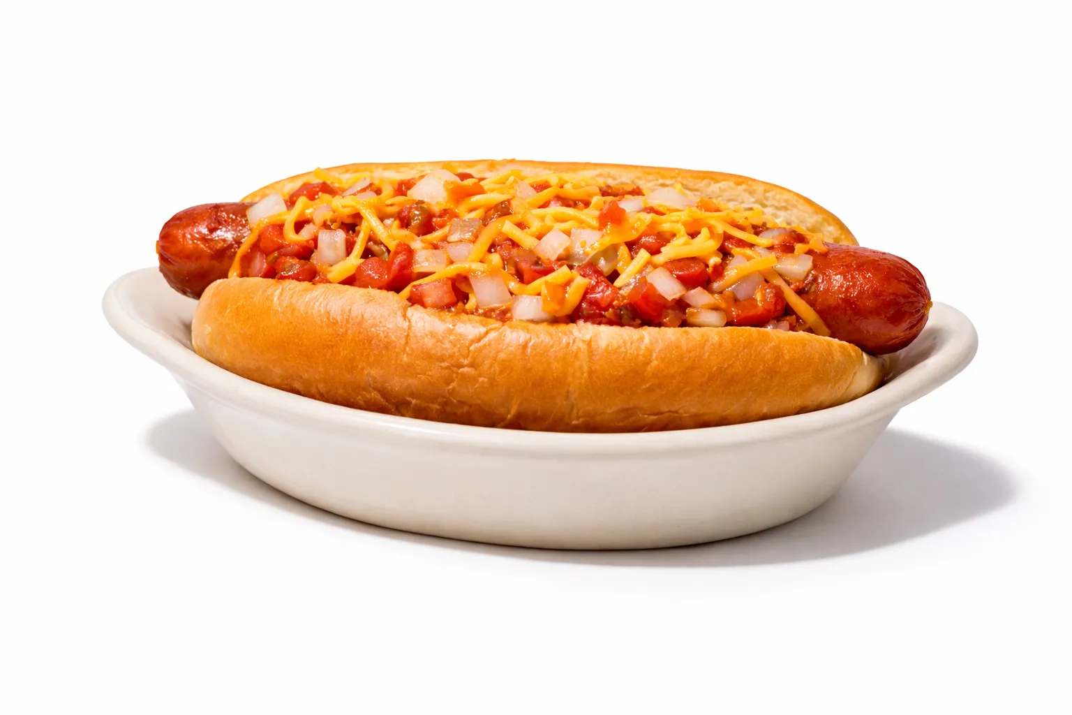 Foot long all beef hot dog with mustard, cheddar, chili, and diced onion.